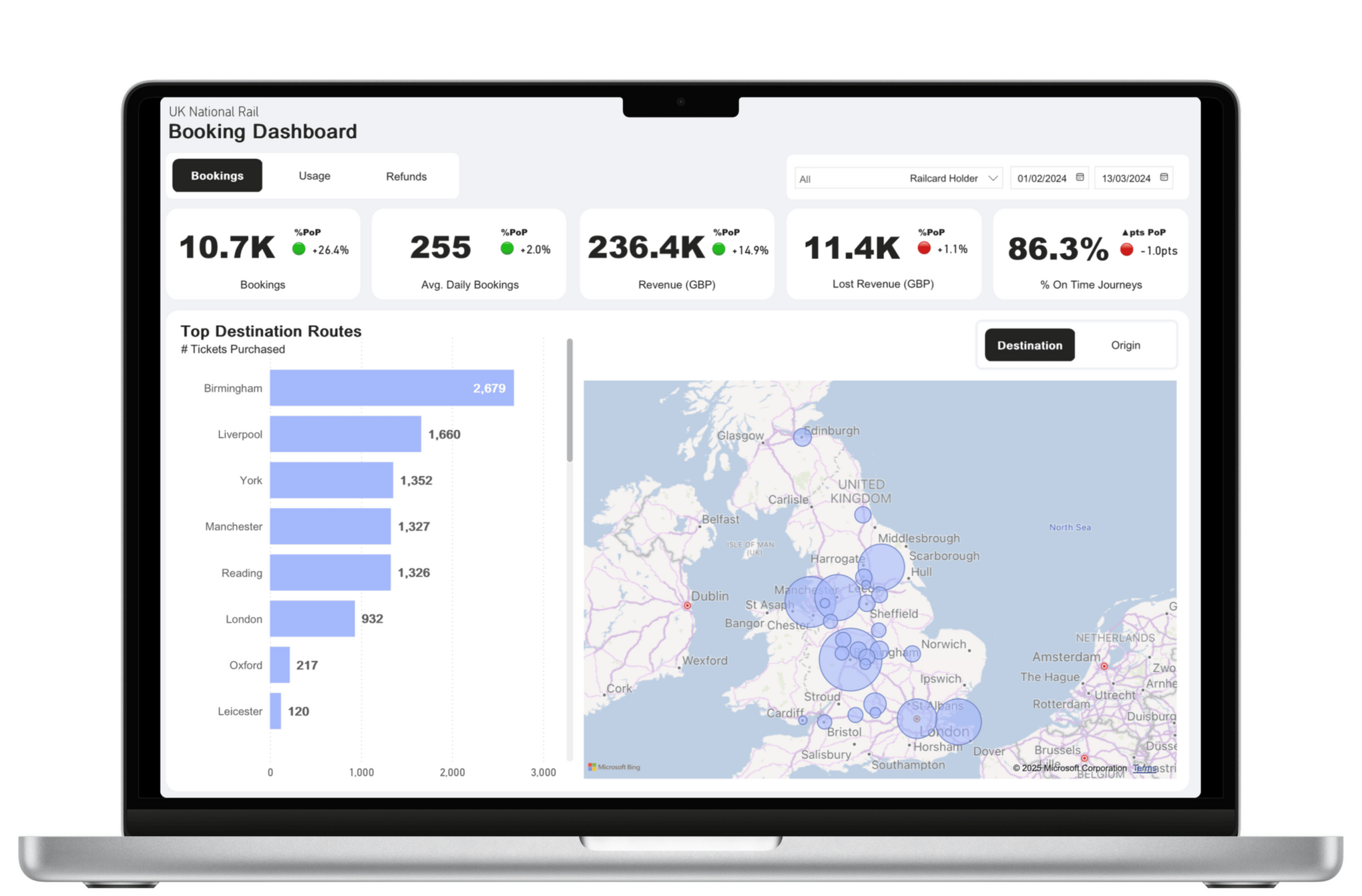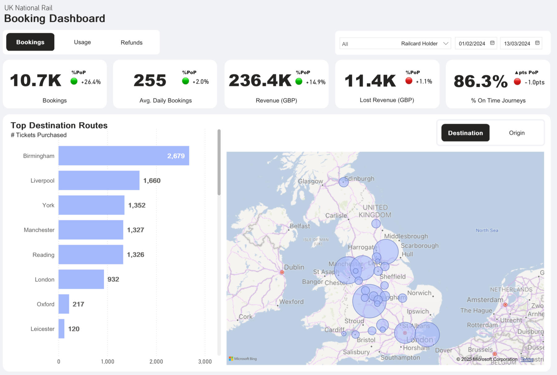Booking analysis and visualisation for the UK National Rail, focusing on purchase trends, railcard usage and refunds patterns.